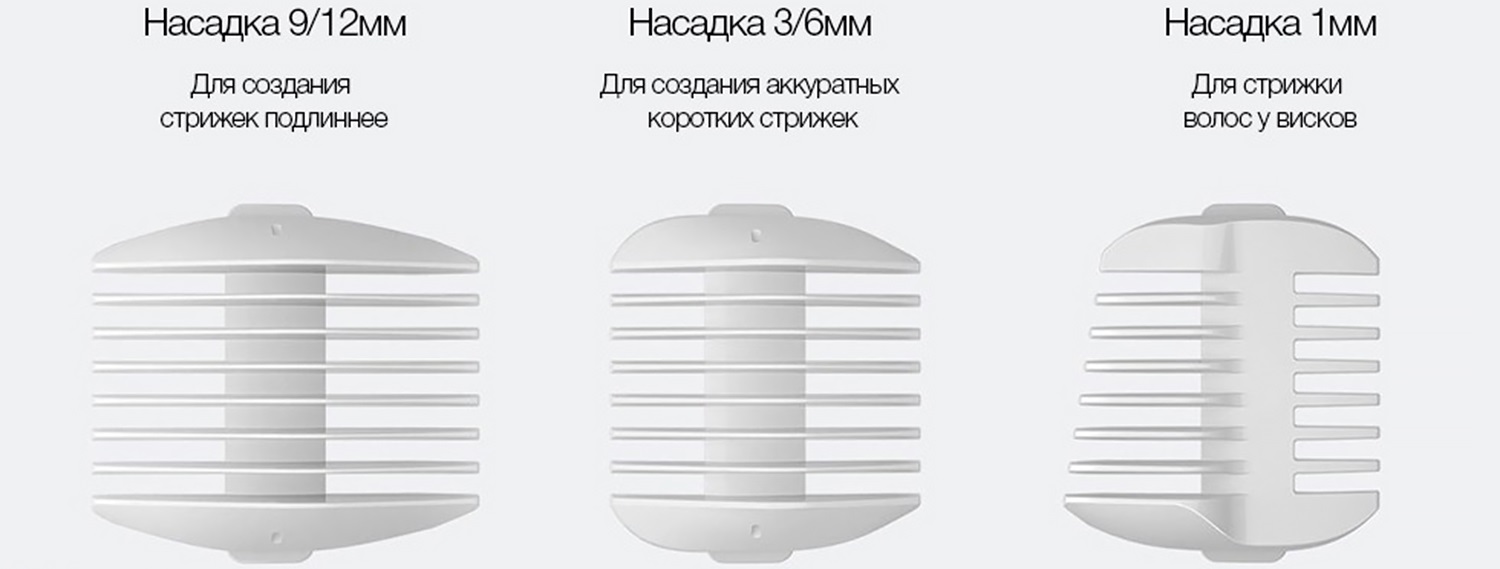 В комплект входит 3 насадки. Благодаря им вы сможете регулировать длину волоса, а также подравнивать волосы у висков. Съемная режущая головка позволяет промывать машинку под струей воды. Утопленная кнопка предотвращает случайное нажатие во время работы и хранения