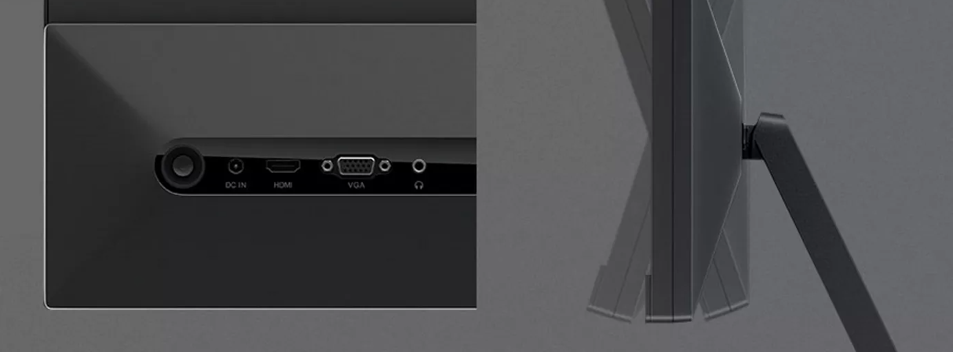 На тыльной поверхности монитора Redmi Display 27″ расположено сразу несколько разъемов для различных подключений. Предусмотрены HDMI и VGA для подключения к компьютеру, а также аудиоразъем для наушников 3.5мм. Там же расположена единственная кнопка управления девайсом.