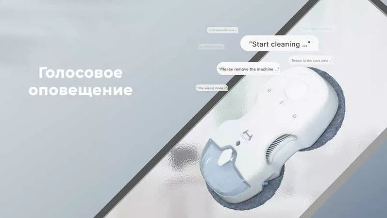 В процессе работы робот комментирует все этапы уборки и напоминает о необходимости забрать стеклоочиститель после уборки.