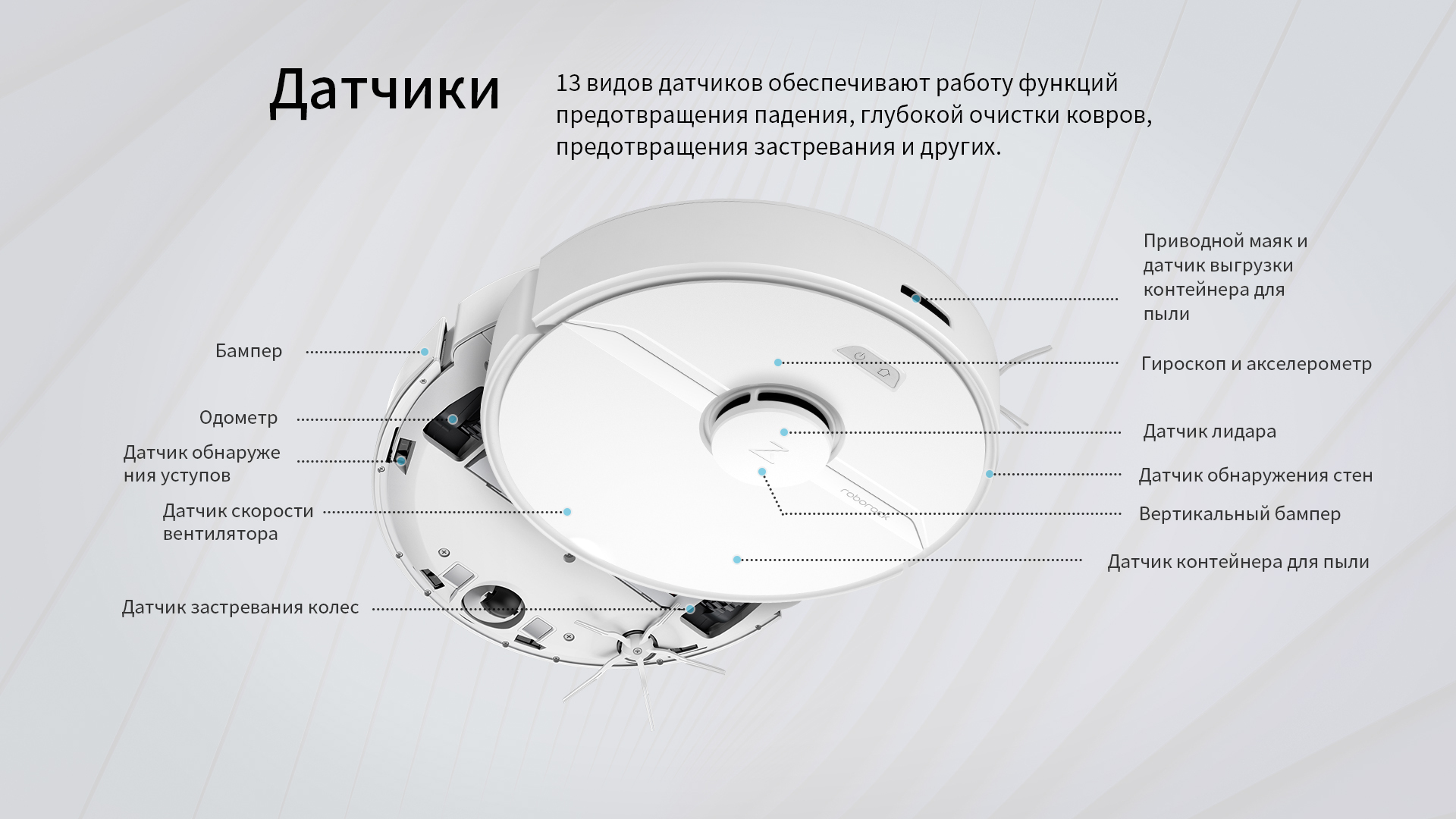 | Типы датчиков и сенсоров | LDS-датчик (Лидар)датчик перепада высотыдатчик распознавания пороговдатчики обнаружения препятствий |
