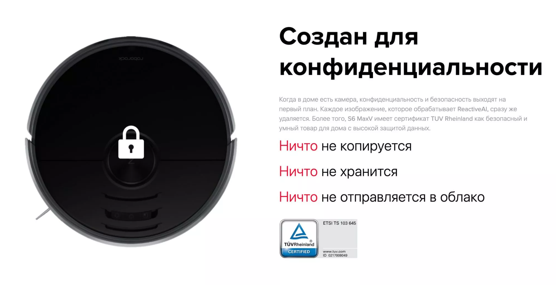 Во время работы всех датчиков, расположенных на корпусе пылесоса, а также при съемке камер и сбора любых других данных помещения, Roborock S6 MaxV никуда не отправляет собранную информацию, не передает её третьим лицам и не отправляет на облачное хранилище. Вы можете не беспокоиться о полной сохранности вашей личной жизни.