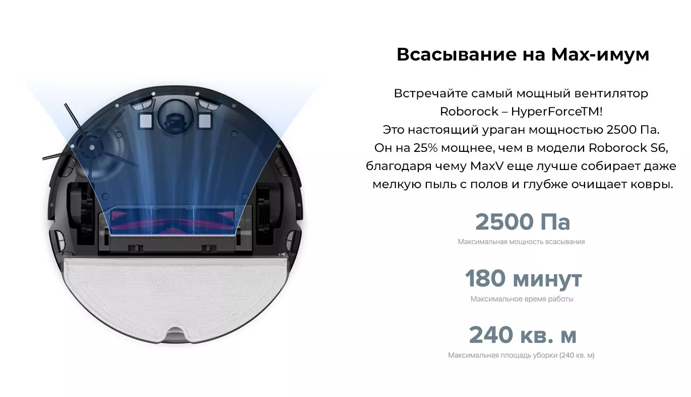 Благодаря усовершенствованному двигателю всасывающая мощность нового робота-пылесоса достигает 2500 Па, то есть девайс стал на 25% мощнее, чем обычная модель Roborock S6. С такой мощностью пылесос легко справится с глубокой очисткой ковров, не говоря уже об удалении пыли, песка и более крупного мусора с пола.