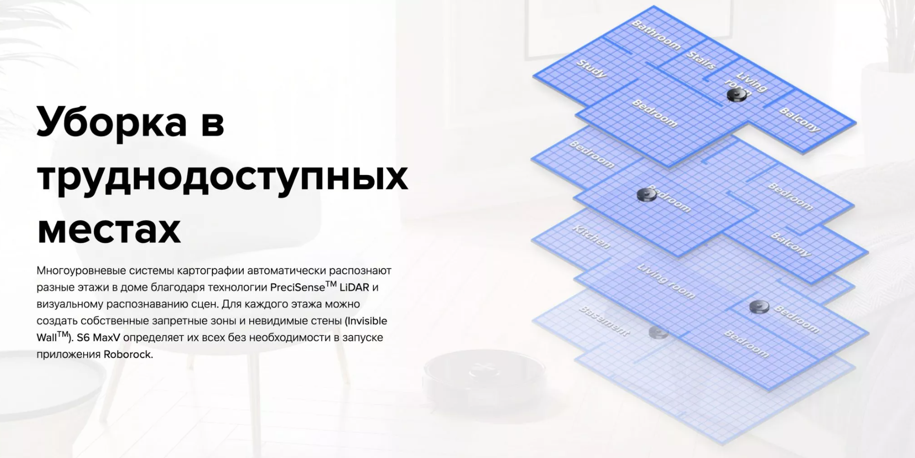 Системы многоуровневого картирования используют PreciSense LiDAR и визуальное распознавание сцен для автоматического определения разных этажей дома. На каждом этаже могут быть независимые запретные зоны, невидимые стены и запретные секторы. Roborock S6 MaxV сделает уборку вашего дома проще, чем вы могли бы себе представить.