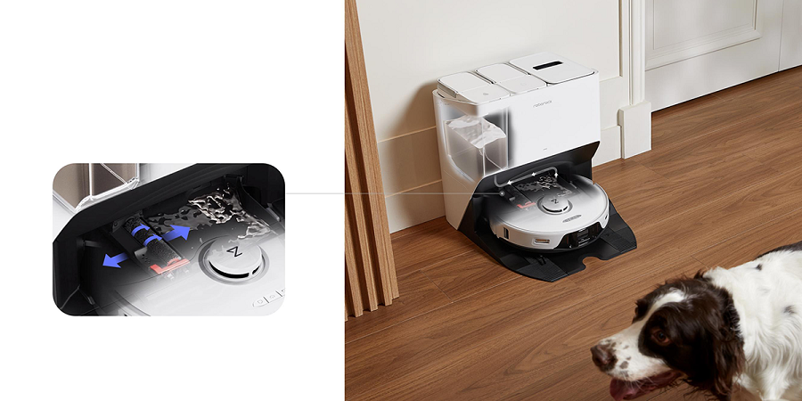 Робот-пылесос автоматически выгружает мусор и пыль после уборки, благодаря чему может работать до 7 недель без замены мешка для сбора пыли. Двойные щетки очищаются автоматически для упрощения обслуживания.