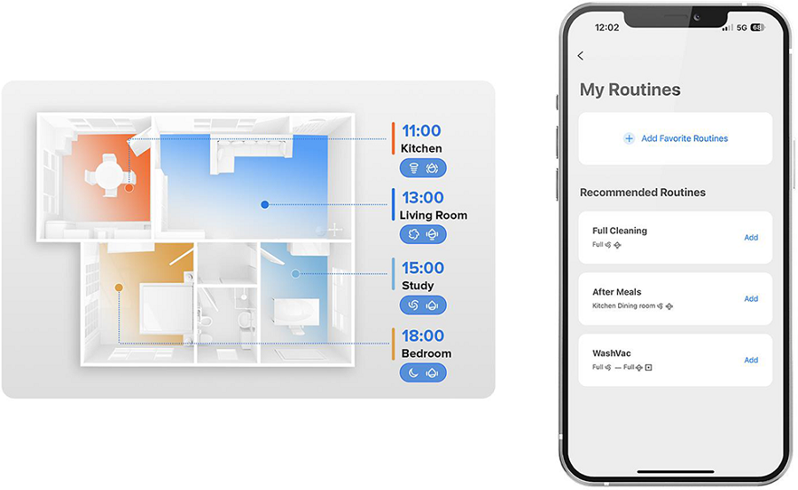 Задавайте время работы робота-пылесоса с помощью графика уборки и настраивайте процессы уборки в определенных частях вашего дома с определенной частотой или по требованию.
