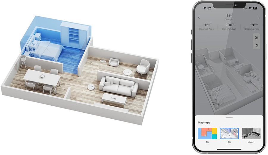 Функция составления ЗD-карт позволяет построить точную модель ваших интерьеров и добавить в нее мебель, чтобы создать подробную карту и выполнить уборку наилучшим образом.