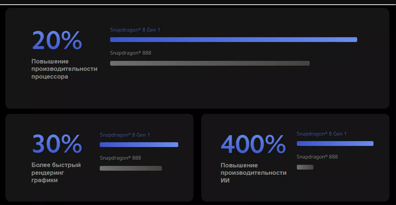 В сравнении в прошлогодним Snapdragon 88 новый Snapdragon 8 Gen 1 – это 20% прирост производительности центрального процессора, 30% прирост мощности графического процессора и 400% прирост процессора искусственного интеллекта Qualcomm 7 поколения.
