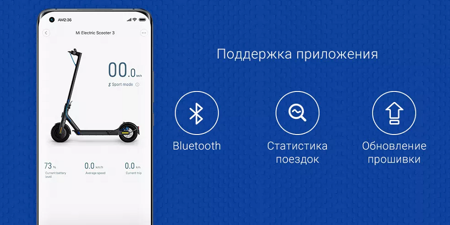 Девайс поддерживает синхронизацию со смартфоном по Bluetooth. Через мобильное приложение можно посмотреть статистику поездок, обновить прошивку и многое другое.